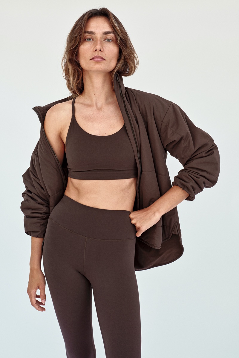 The hues include off-white, grounding neutrals, and buttery yellow. Alongside the leggings, you’ll find clean-cut sports bras, flared bottoms, and cozy layering pieces like padded jackets and hoodies.
